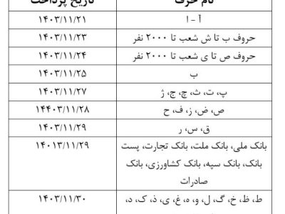 بر اساس این گزارش؛ پرداخت حقوق بهمنماه بازنشستگان تا آخرین روز این ماه و براساس حروف الفبا، طبق جدول ذیل انجام خواهد شد.