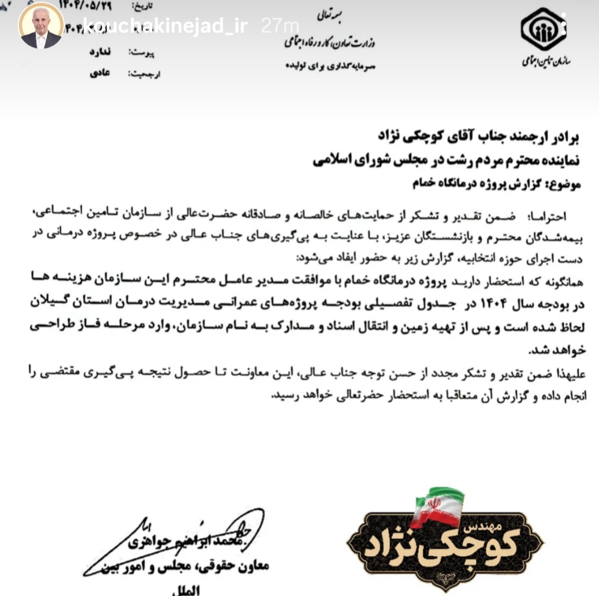 دستور مستقیم معاون حقوقی مجلس و امور بینالملل سازمان، در کنار پیگیریهای مستمر جناب آقای جبار کوچکینژاد، نماینده محترم مردم رشت و خمام در مجلس شورای اسلامی، نقش تعیینکنندهای در تسریع روند تصویب و تخصیص اعتبار این پروژه داشته است. این همراهی و همافزایی میان مسئولان ملی و نمایندگان محلی، نمونهای موفق از تعامل سازنده برای خدمترسانی به مردم است.