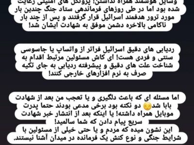 • به گزارش آژانس خبری ریحان؛ دختر شهید سردار شادمانی در واکنش به صحبت‌های رئیس پدافند غیرعامل نوشت: جاسوسی فراتر از واتس‌اپ است، روش‌های اصلی را پیدا کنید./خبرآنلاین