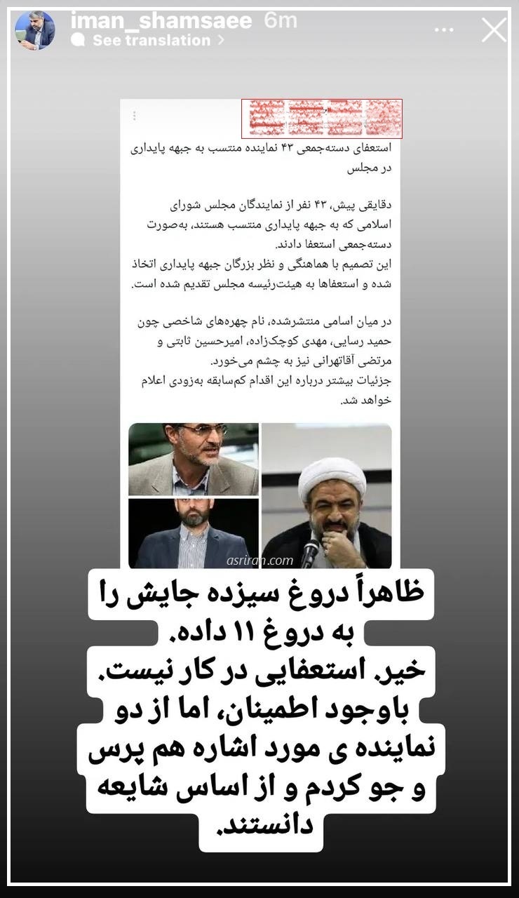 «ظاهرا دروغ ۱۳ جایش را به دروغ ۱۱ داده. خیر. استعفایی در کار نیست. با وجود اطمینان، اما از دو نماینده مورد اشاره هم پرس و جو کردم و از اساس شایعه دانستند.»