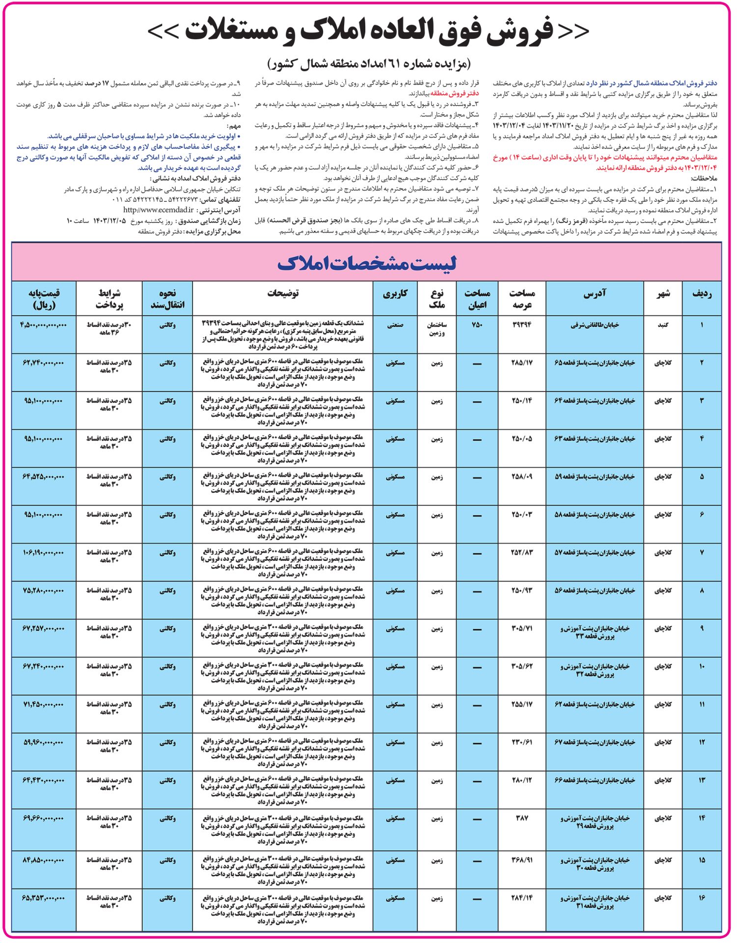 مزایده شماره ۶۱ املاک مجتمع اقتصادی منطقه شمال کشور