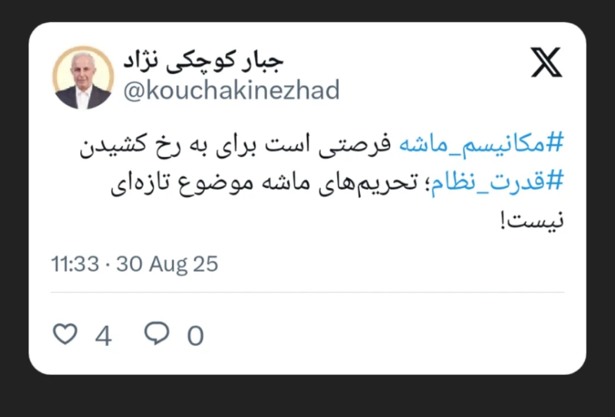 به گزارش آژانس خبری ریحان؛جبار کوچکینژاد، نماینده مردم رشت در مجلس شورای اسلامی، در توییتی با اشاره به تحریمهای موسوم به «ماشه» تأکید کرد که این موضوع تازگی ندارد و جمهوری اسلامی میتواند از آن به عنوان فرصتی برای به رخ کشیدن قدرت نظام استفاده کند. وی با هشتگهای #مکانیسم ماشه و #قدرت نظام، بر آمادگی کشور در برابر فشارهای بینالمللی تأکید کرد.